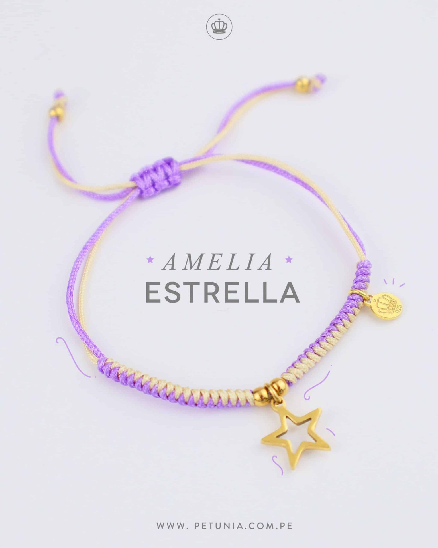 Pulsera tejida en hilo color lila y beige con dije en forma de estrella y charm de coronita petunia