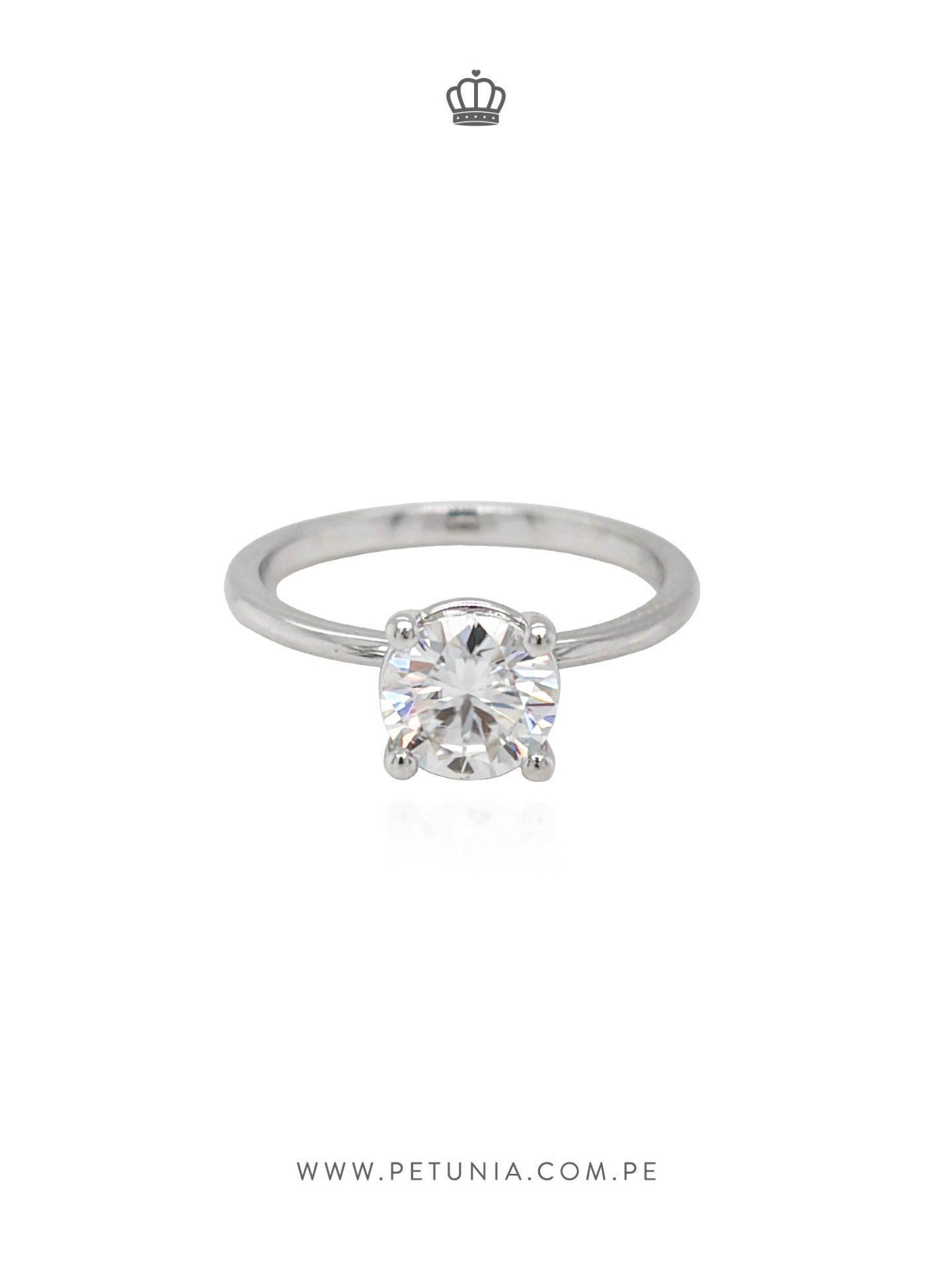 Anillo de compromiso hecho en plata 925, la piedra central es una moissanita de corte circular, tallada para maximizar su brillo y claridad. Sostenida por una estructura y engaste de 4 uñas, este diseño permite que la luz penetre en la piedra desde todos los ángulos, realzando su resplandor natural.