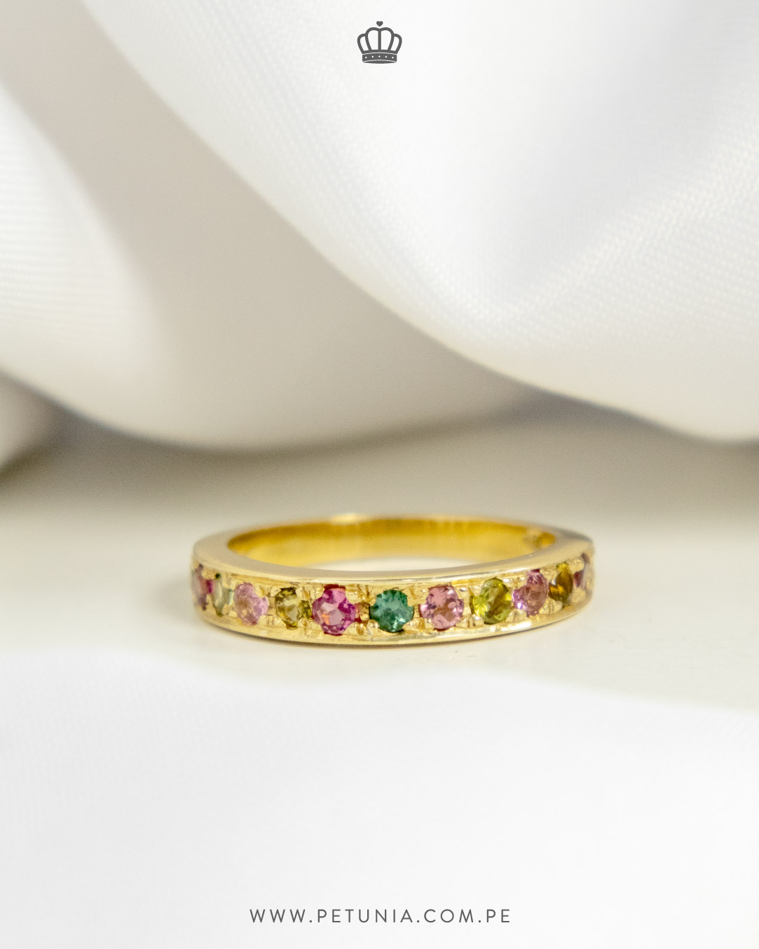 Añade un toque de color y sofisticación a tu colección con este deslumbrante anillo medio rivier elaborado en oro amarillo 18k. Una selección de turmalinas naturales en tonos vibrantes se alinea con precisión sobre un diseño clásico y refinado, creando una joya versátil, luminosa y femenina.