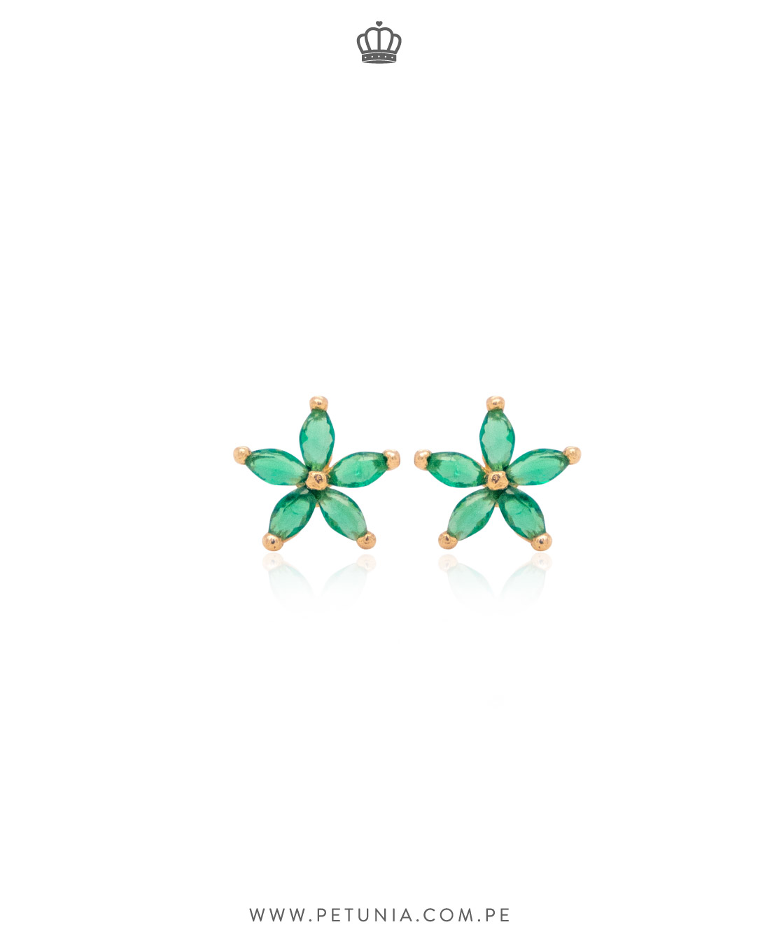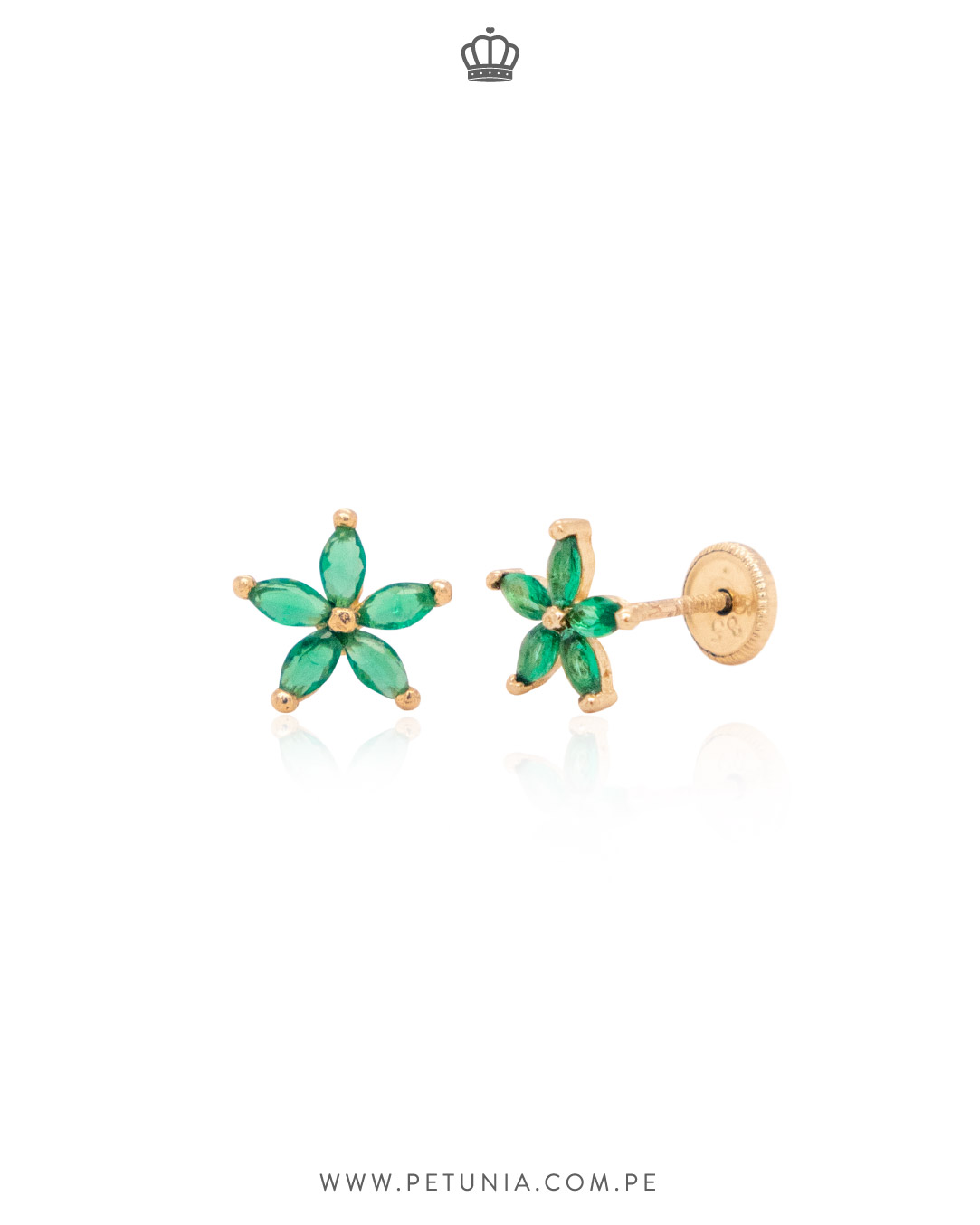 Aretes hecho en oro italiano 14k amarillo en forma flor con 5 pétalos color verde. Tiene broche plano enroscable. Lleno de brillo ideal para lucir un ear look shinny.