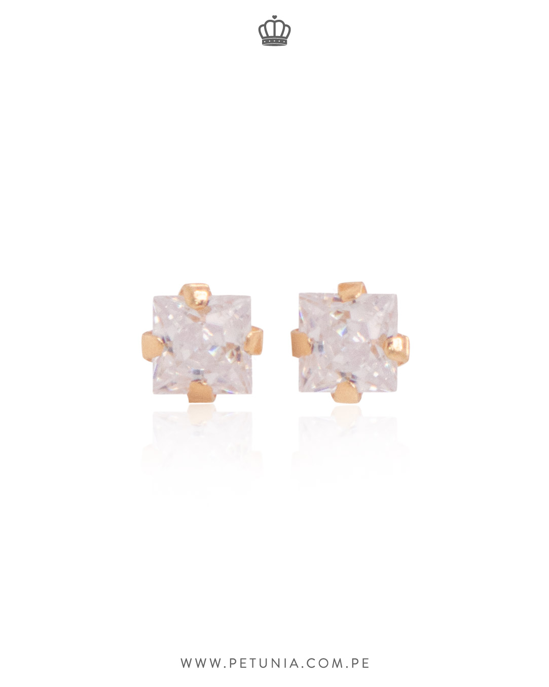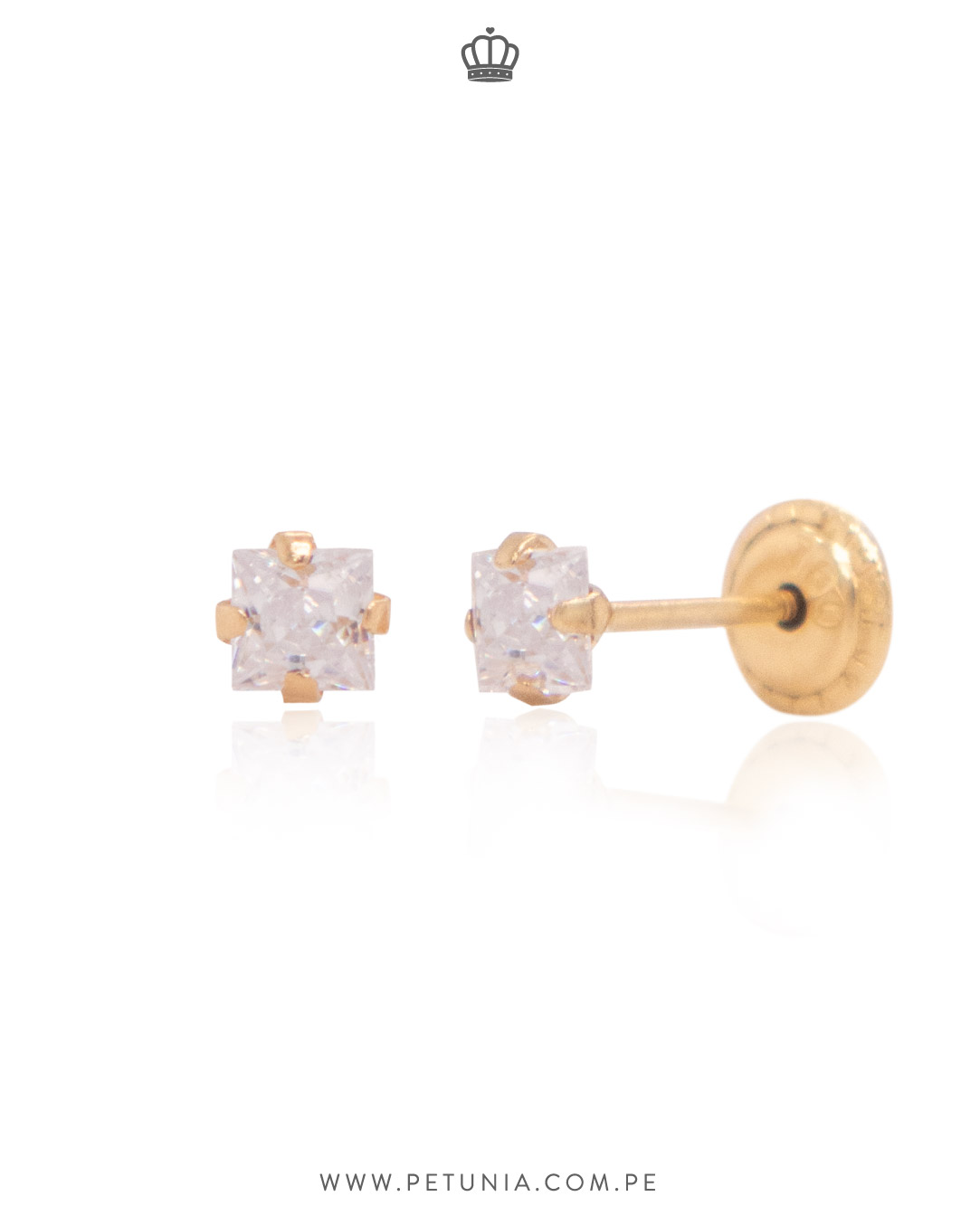 Aretes de oro amarillo 18k con cristal blanco de forma cuadrada. Tiene broche «rosca 3 vueltas» para mayor seguridad.