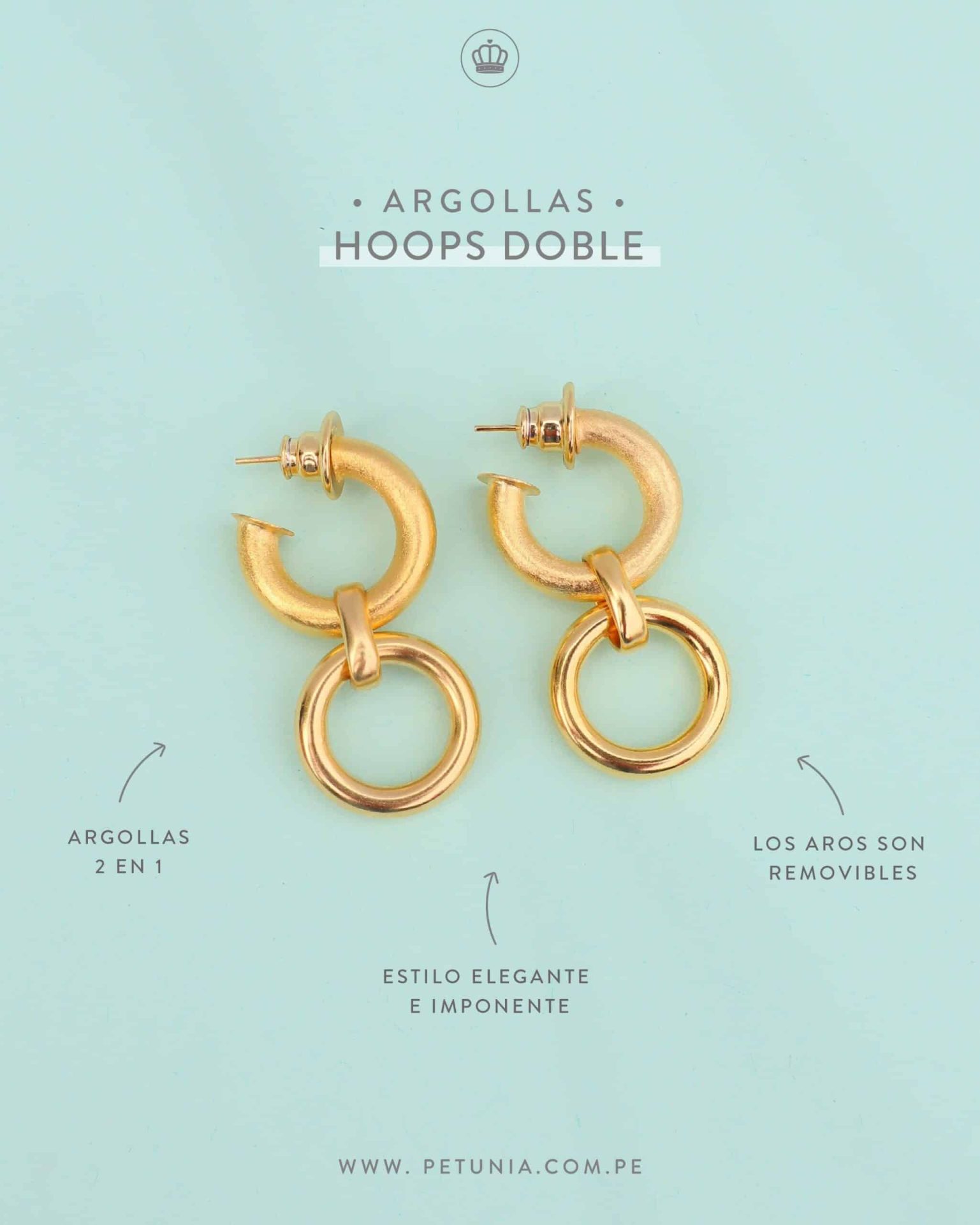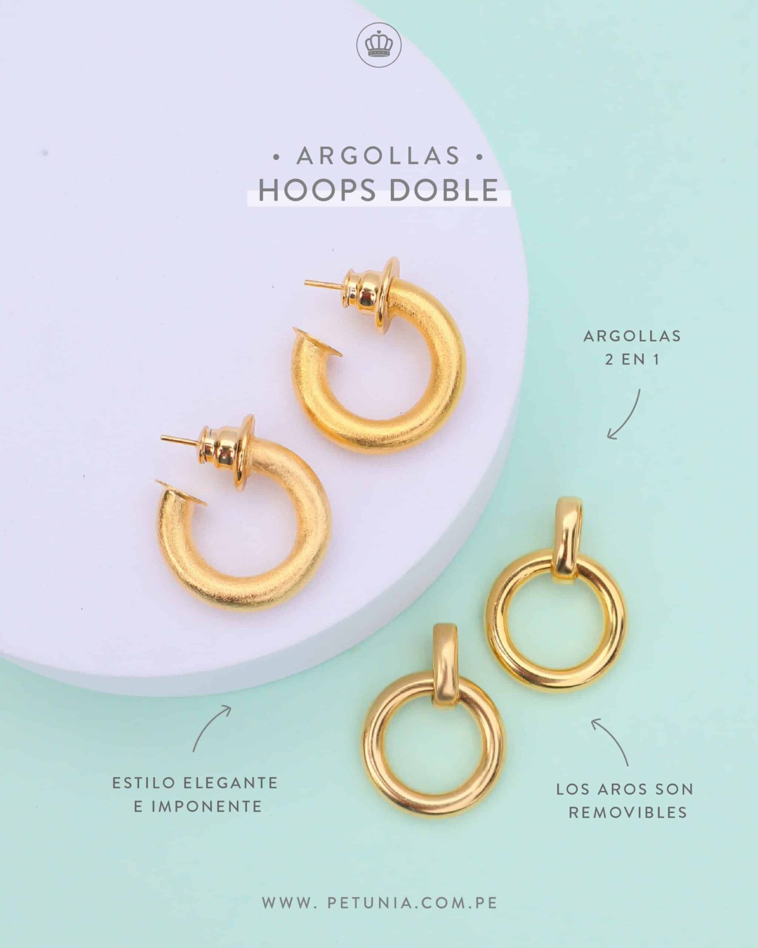 Argollas laminadas en oro 2 en 1 color dorado con acabados arenado y brillante. Tiene un estilo elegante e imponente. Los aros son removibles y podrás crear varios looks, clásico y elegante.