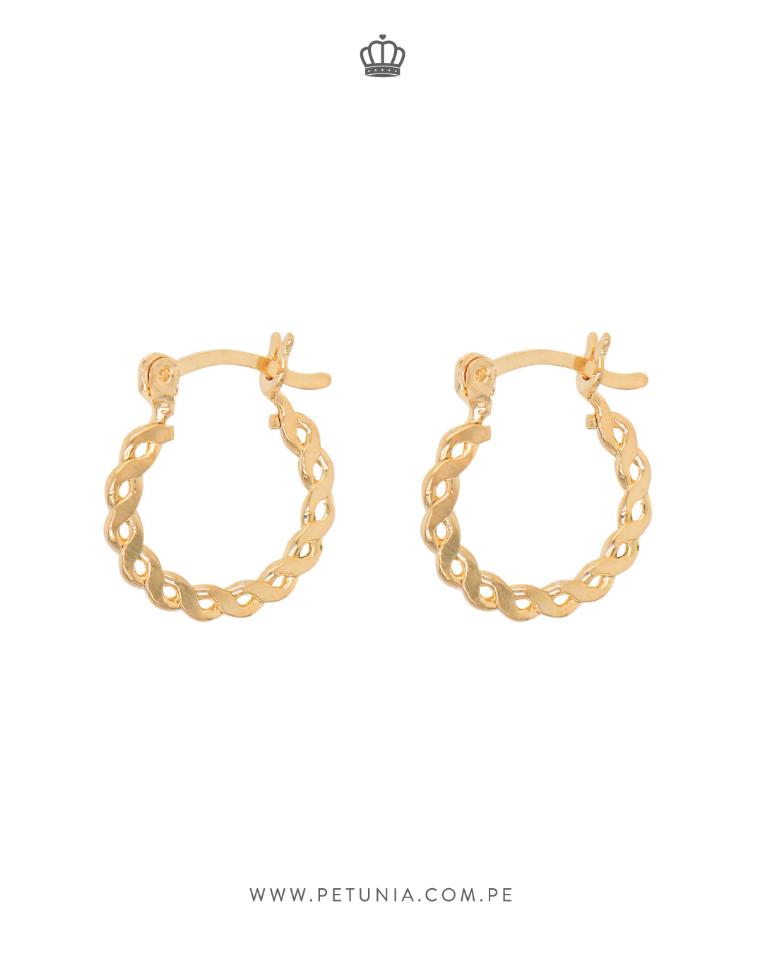 Argollas laminadas en oro de forma circular con tejido entrelazada, discretos que aportan elegancia y sencillez.