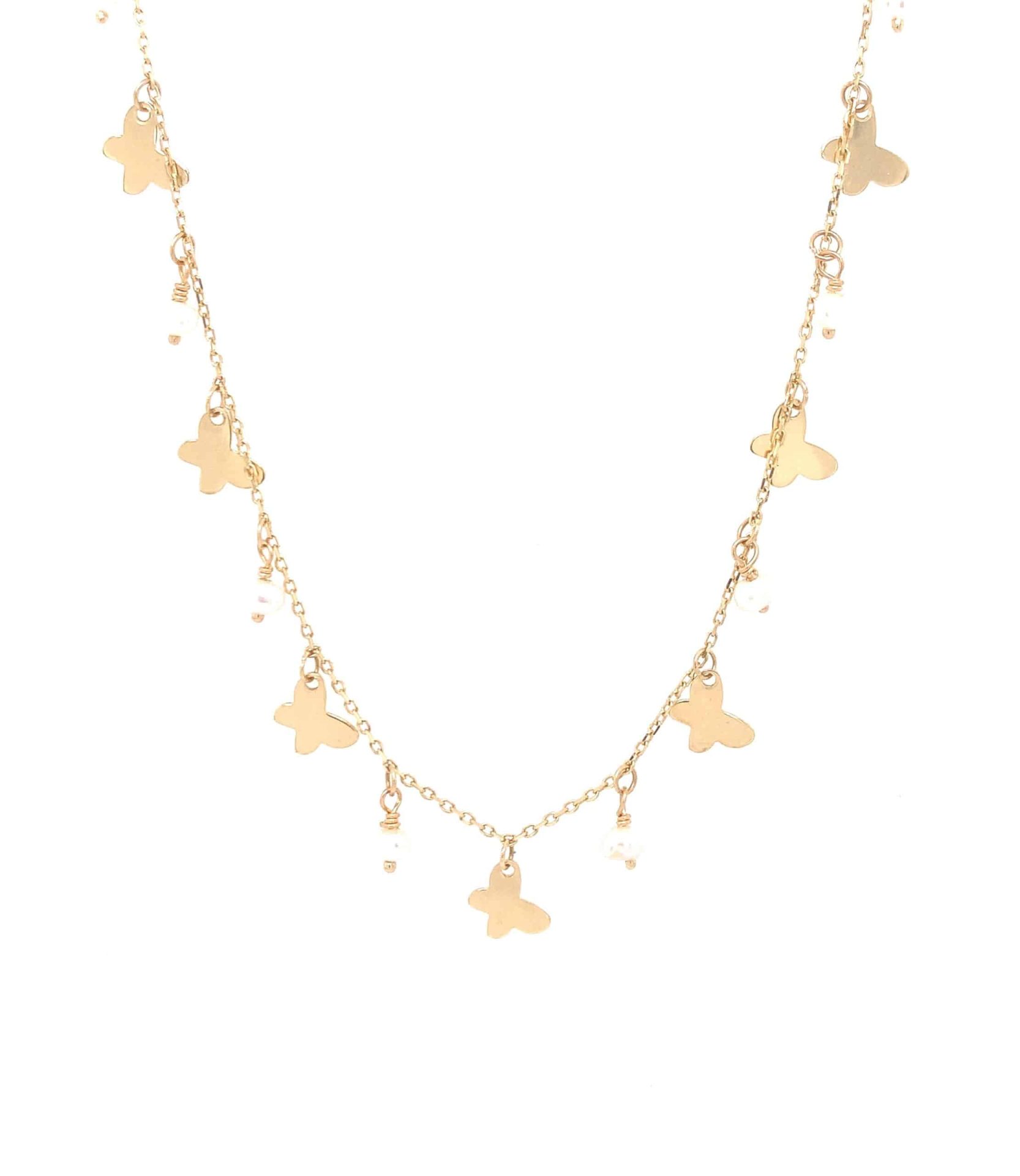 Cadena de oro italiano 14k con charms mini de mariposa y perlita de rio. Estilo minimalista y delicado. Puedes usarlo como chocker o cadena y usarlo con mas cadenas.