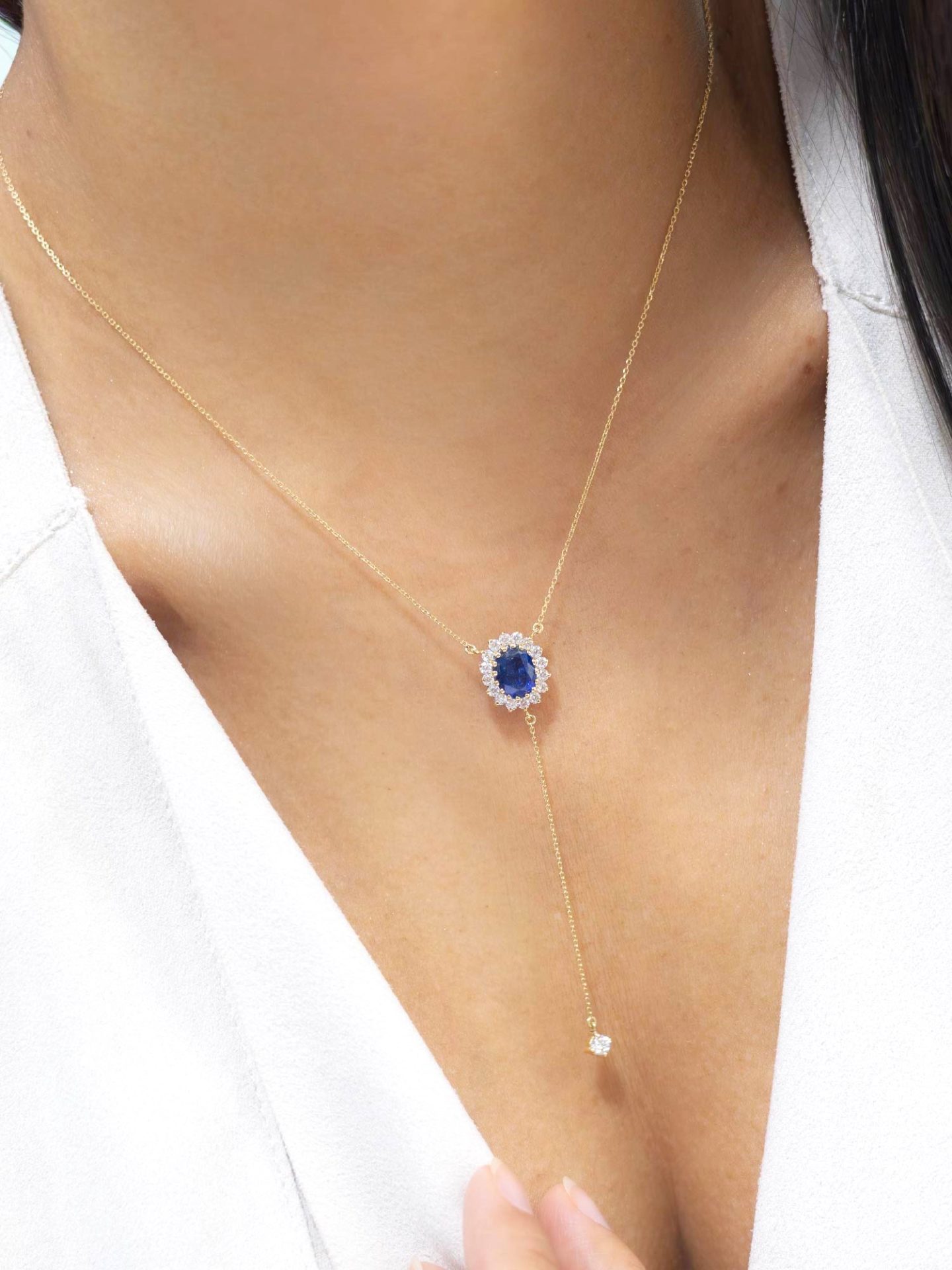 Rodeada por cristales blancos que capturan la luz con cada movimiento, la cianita se convierte en el centro de una joya que equilibra sofisticación y significado. Su diseño estiliza el escote y aporta un toque sutilmente sensual y moderno.
