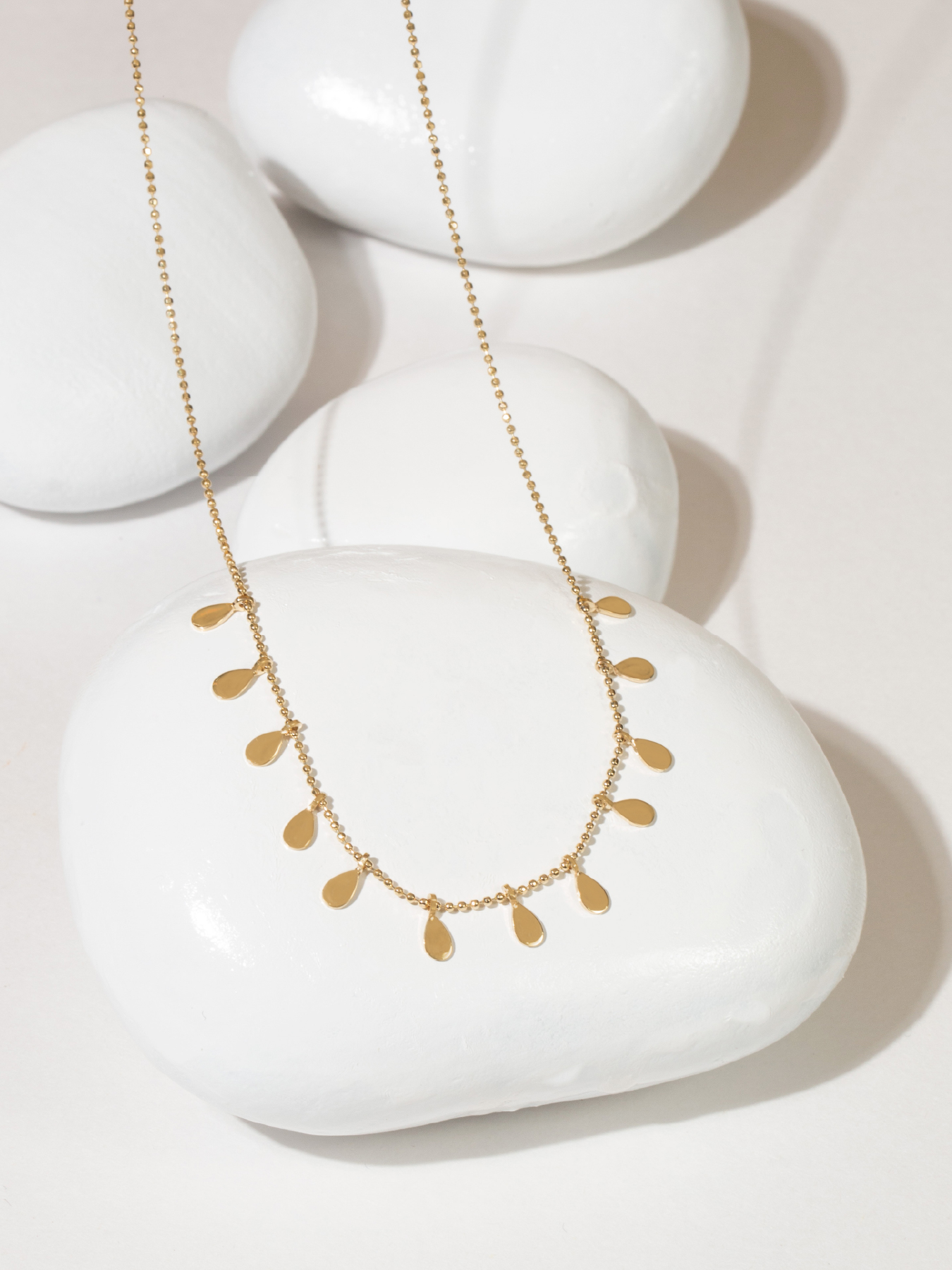 Cadena de oro italiano 14k en forma de puntitos con charms en forma de gotas. Estilo delicado y sutil. Ideal para armar layering con otras cadenas.