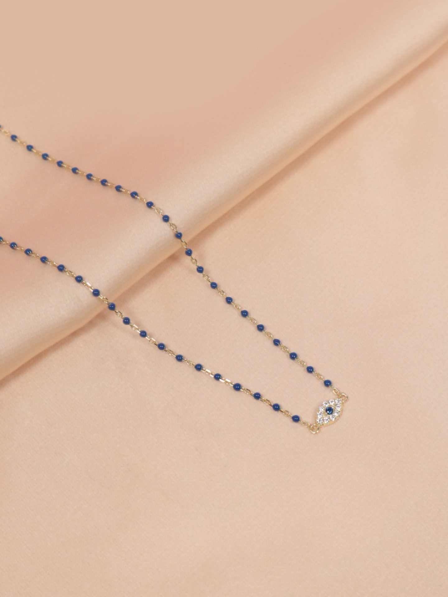 Cadena de plata bañado en oro con full beads color azul y ojo turco con cristales.