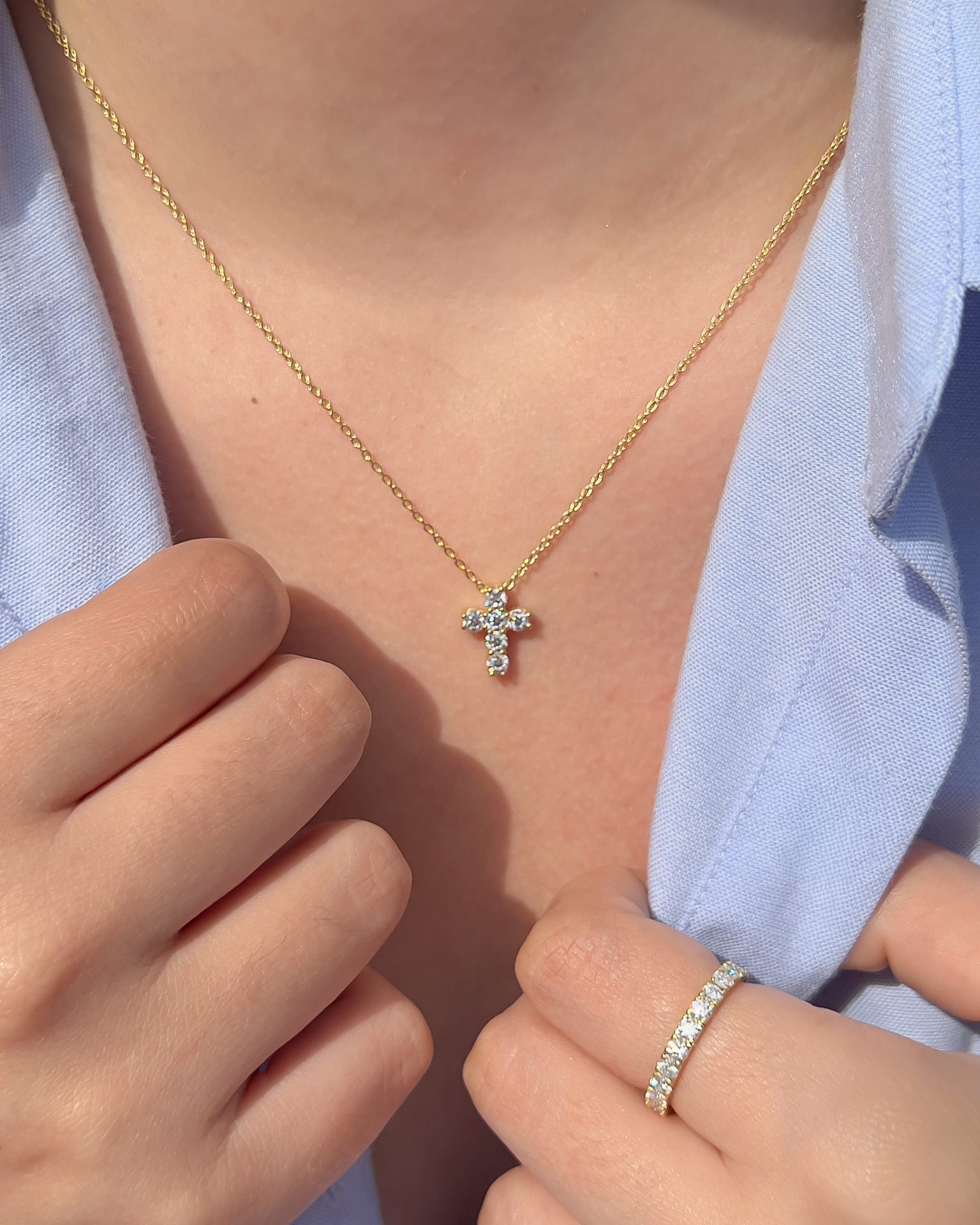 Cadena de plata 925 con baño de oro y dije de cruz con full moissanitas. Ideal para primera comunión o bautizo. Llévalo como símbolo de protección.