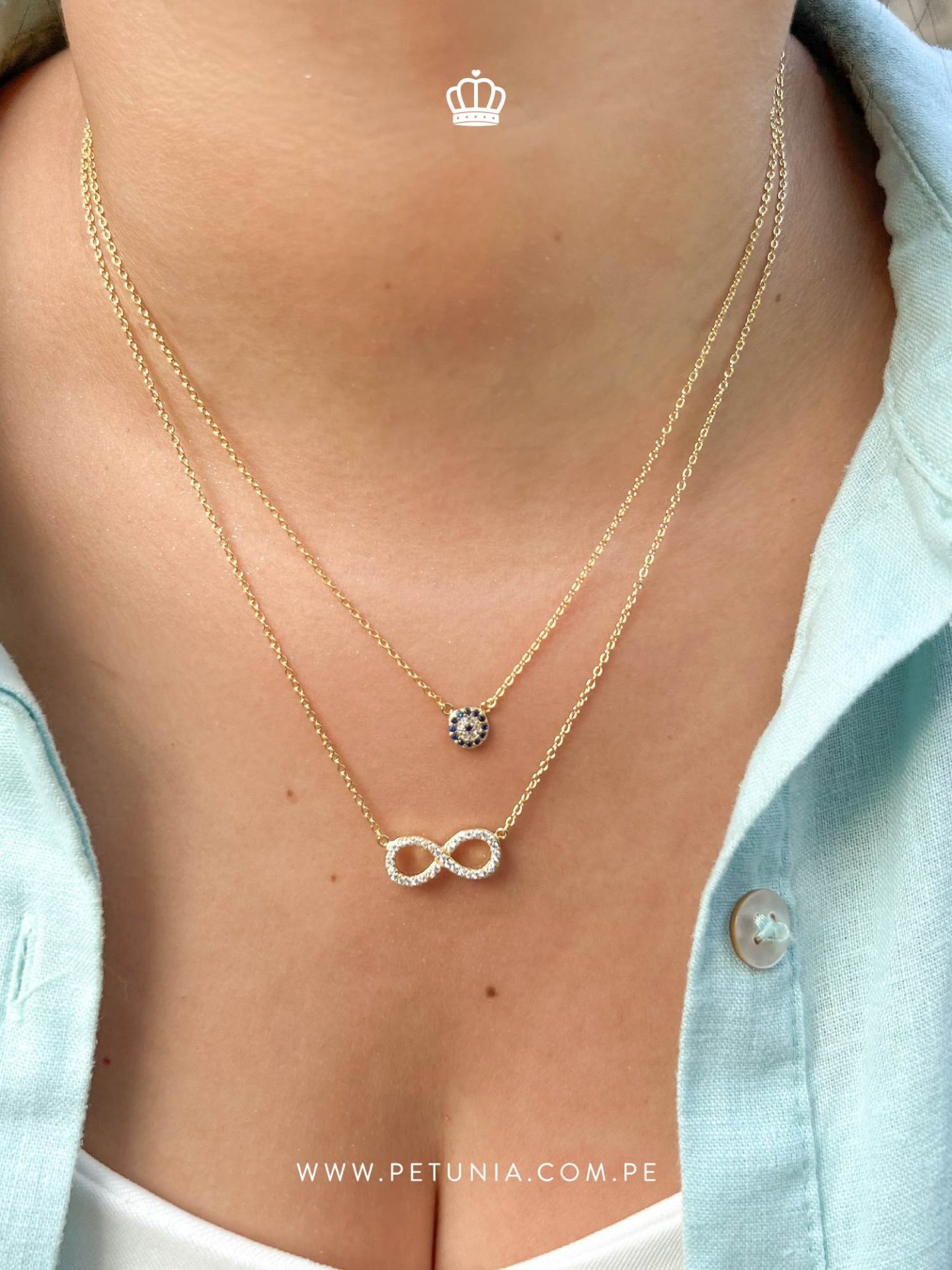 Cadena de plata bañada en oro con charm de infinito con apliques de cristales.