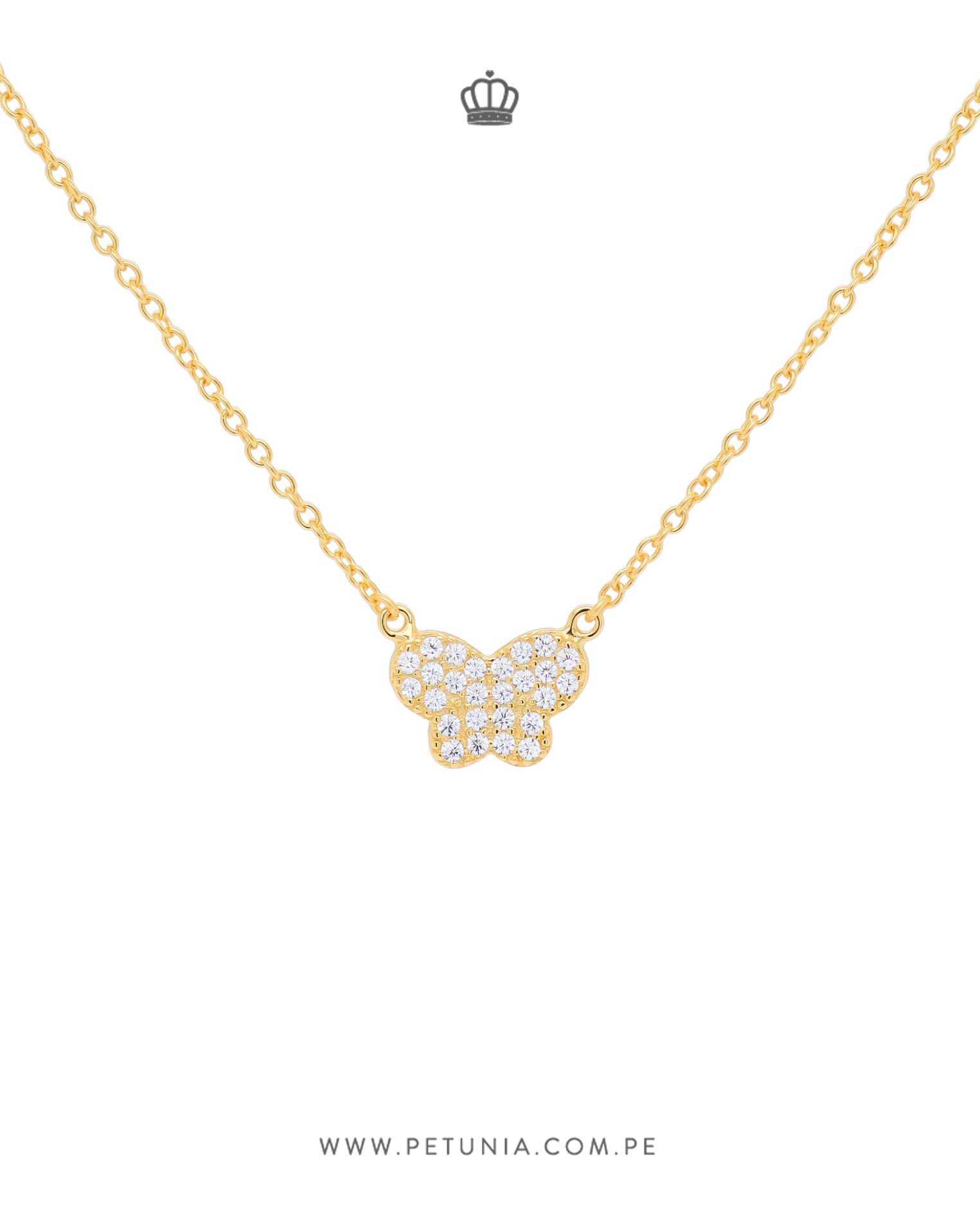 Cadena de plata 925 con baño de oro 18k y dije forma de mariposa con incrustaciones de cristales color blanco. ¡Prepárate para brillar por donde vayas!