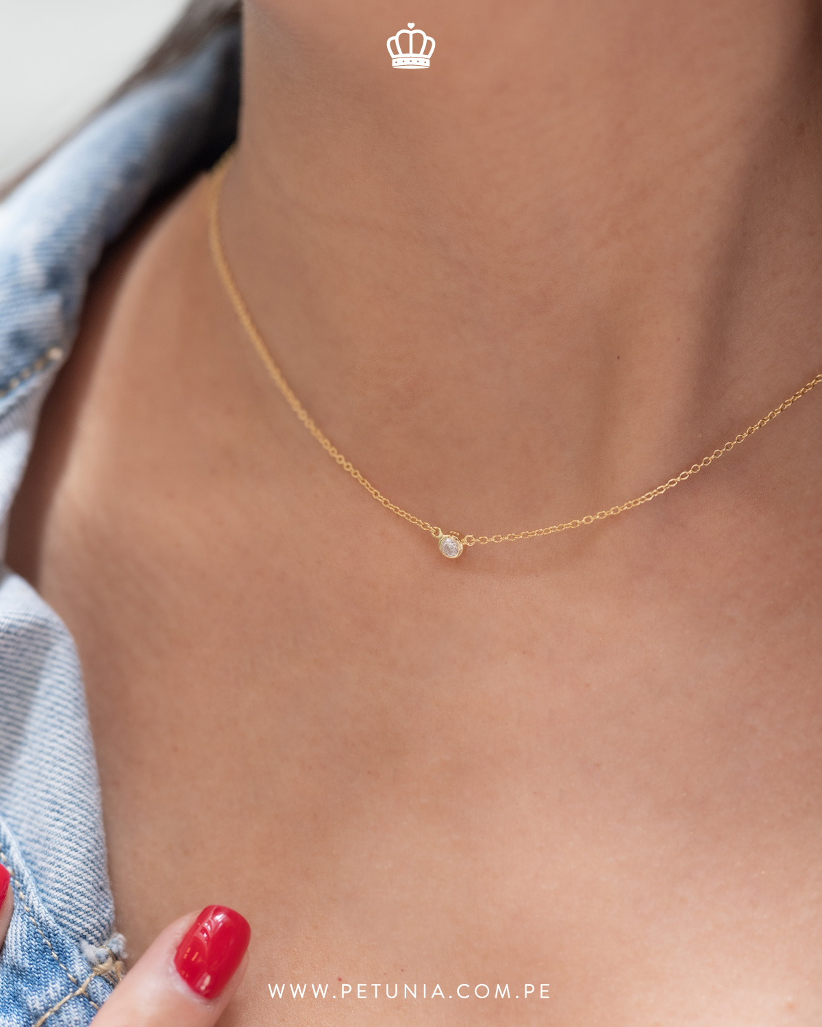 Cadena de plata 925 con baño de oro con cristal color blanco. Estilo minimalista y delicado, perfecto para llevar en todo momento, tanto de día como de noche.