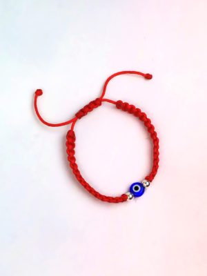 Pulsera tejida con hilo de algodón color negro y ojo turco rojo para la protección con bolitas de plata.