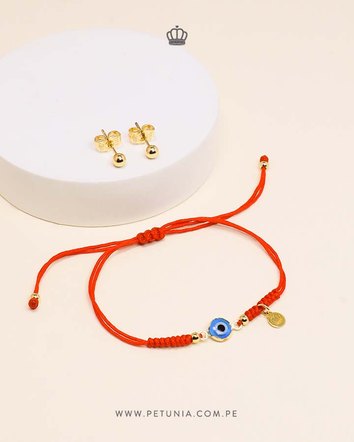 Pack de pulsera con aretes en forma de bola y pulsera tejida con hilo de algodon rojo y ojo turco protector color celeste.