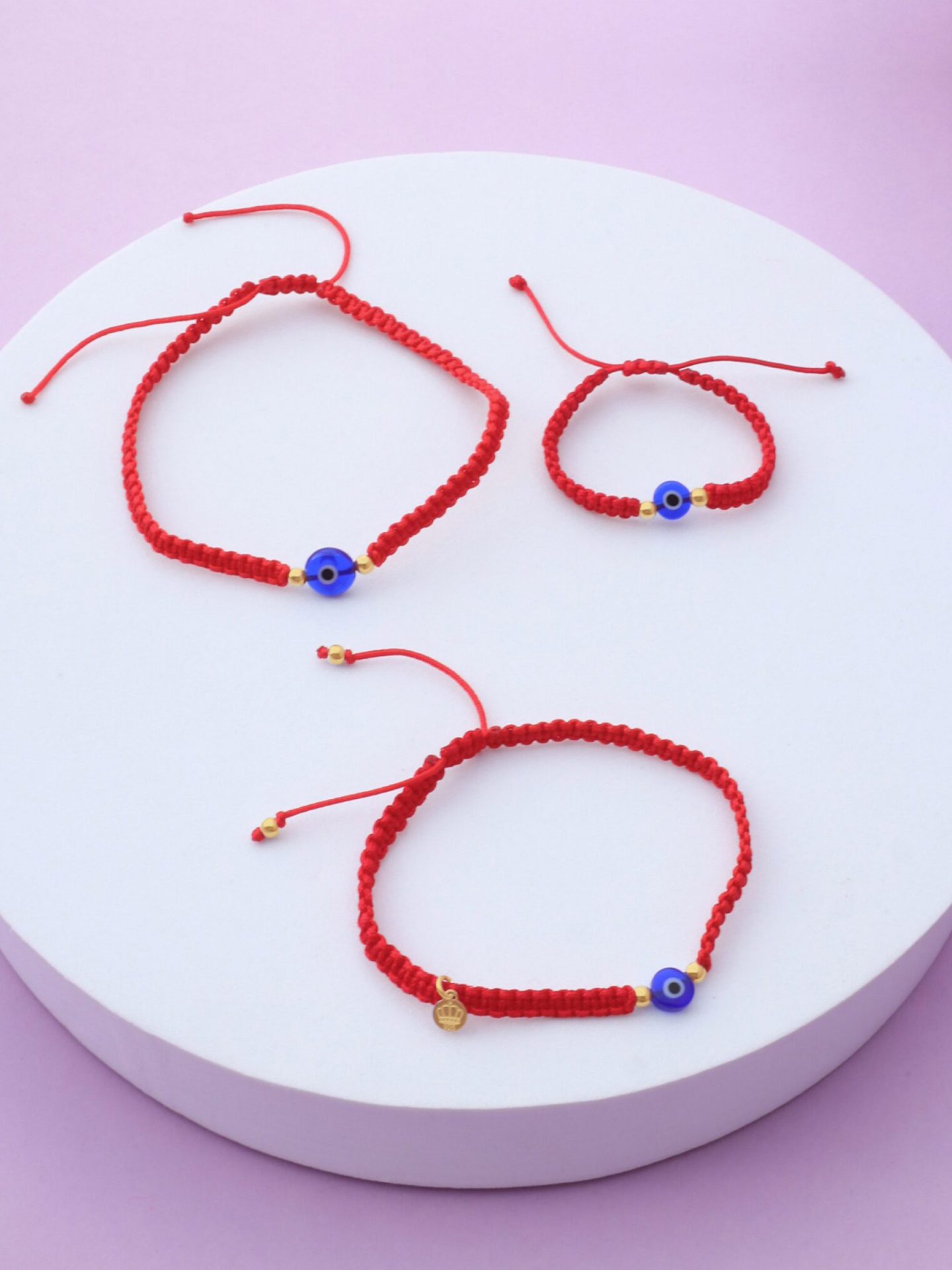El set Nico incluye 3 pulseras de hilo rojo con ojo turco azul para papá, mamá y bebé, creadas para acompañarlos siempre con accesorios en oro 18k.