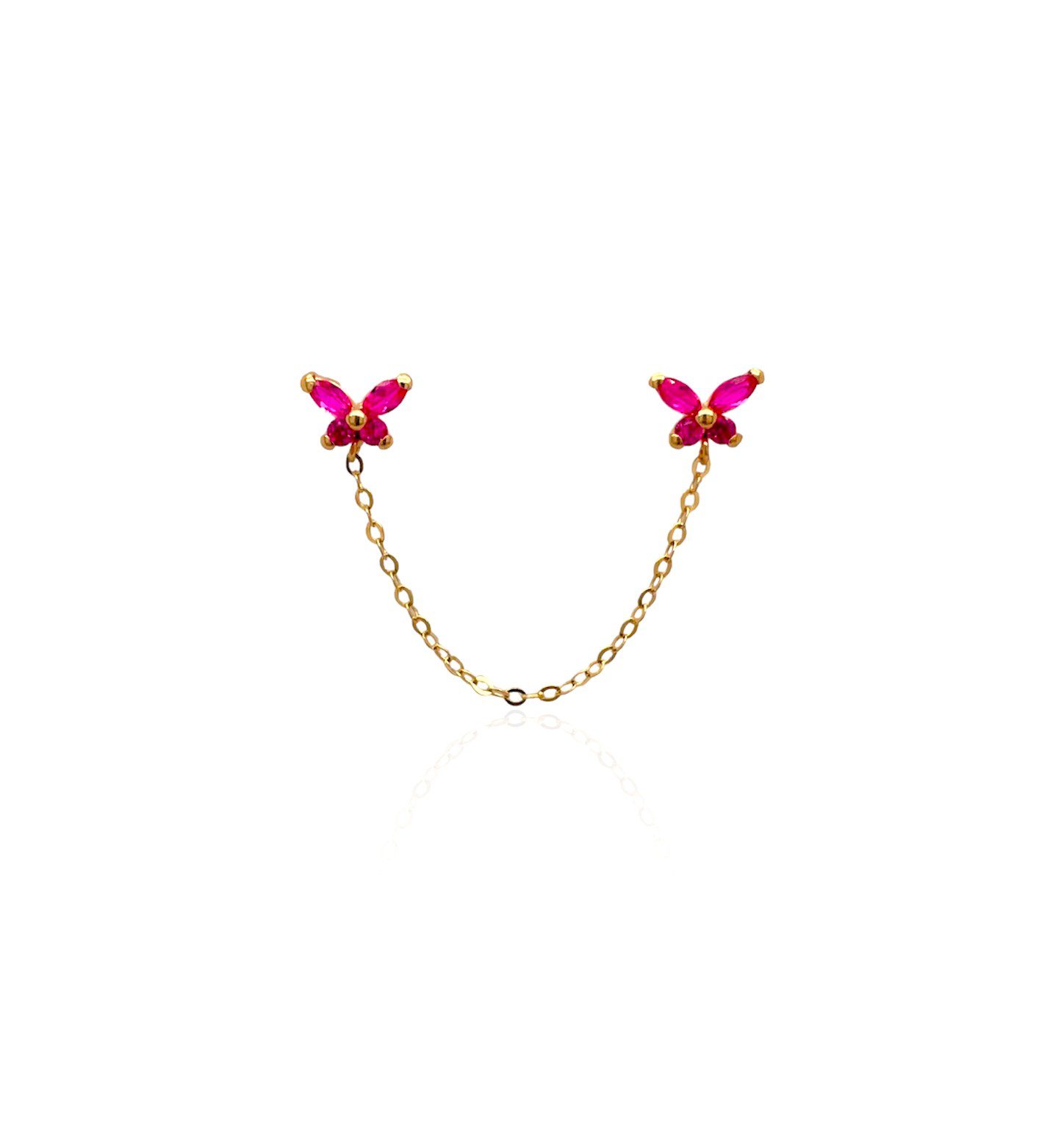 Piercing en oro italiano 14k amarillo con doble mariposa color fucsia y cadena colgante. Lleno de brillo ideal para lucir un ear look full col0r. (Broche mariposa)