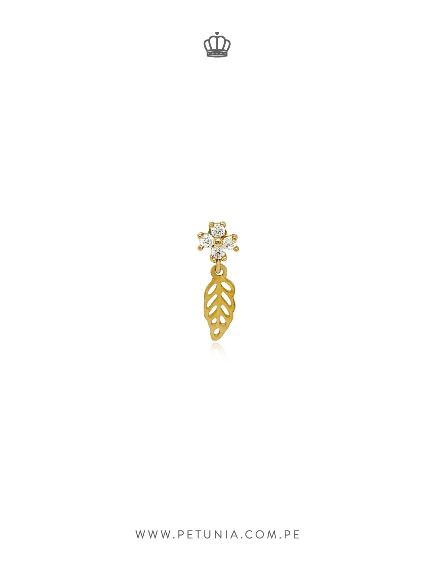 Piercing de oro italiano 14k con roseta de cristales y hojita colgante. ¡Sus detalles le darán ese toque mágico a tu look! Broche plano y enroscable para mayor seguridad y comodidad.