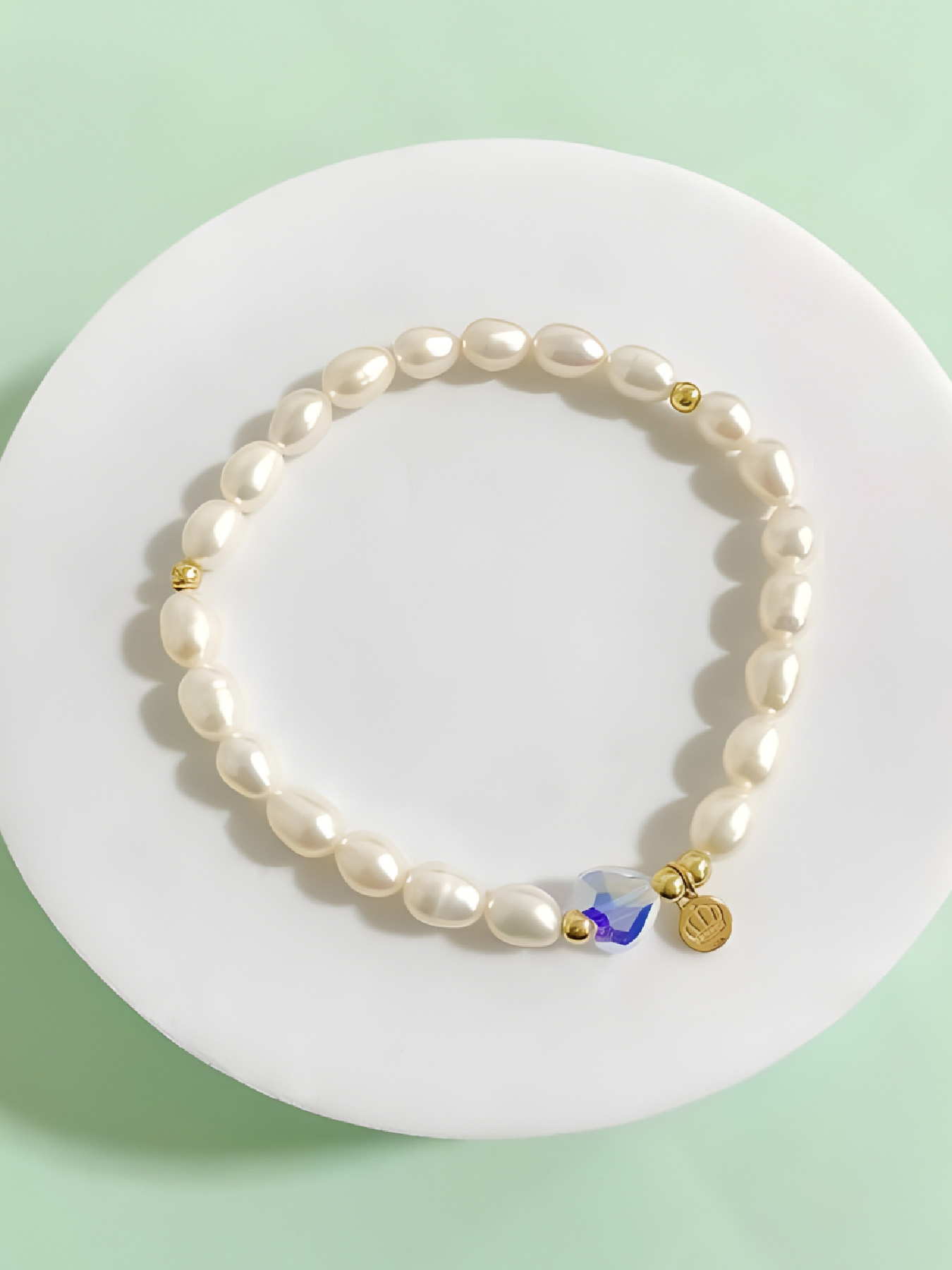 Pulsera de perlas de río naturales con beads y charm de coronita Petunia de oro 18k. Cristal central en forma de corazón color unicornio. Las perlas simbolizan lealtad, generosidad, pureza y elegancia.