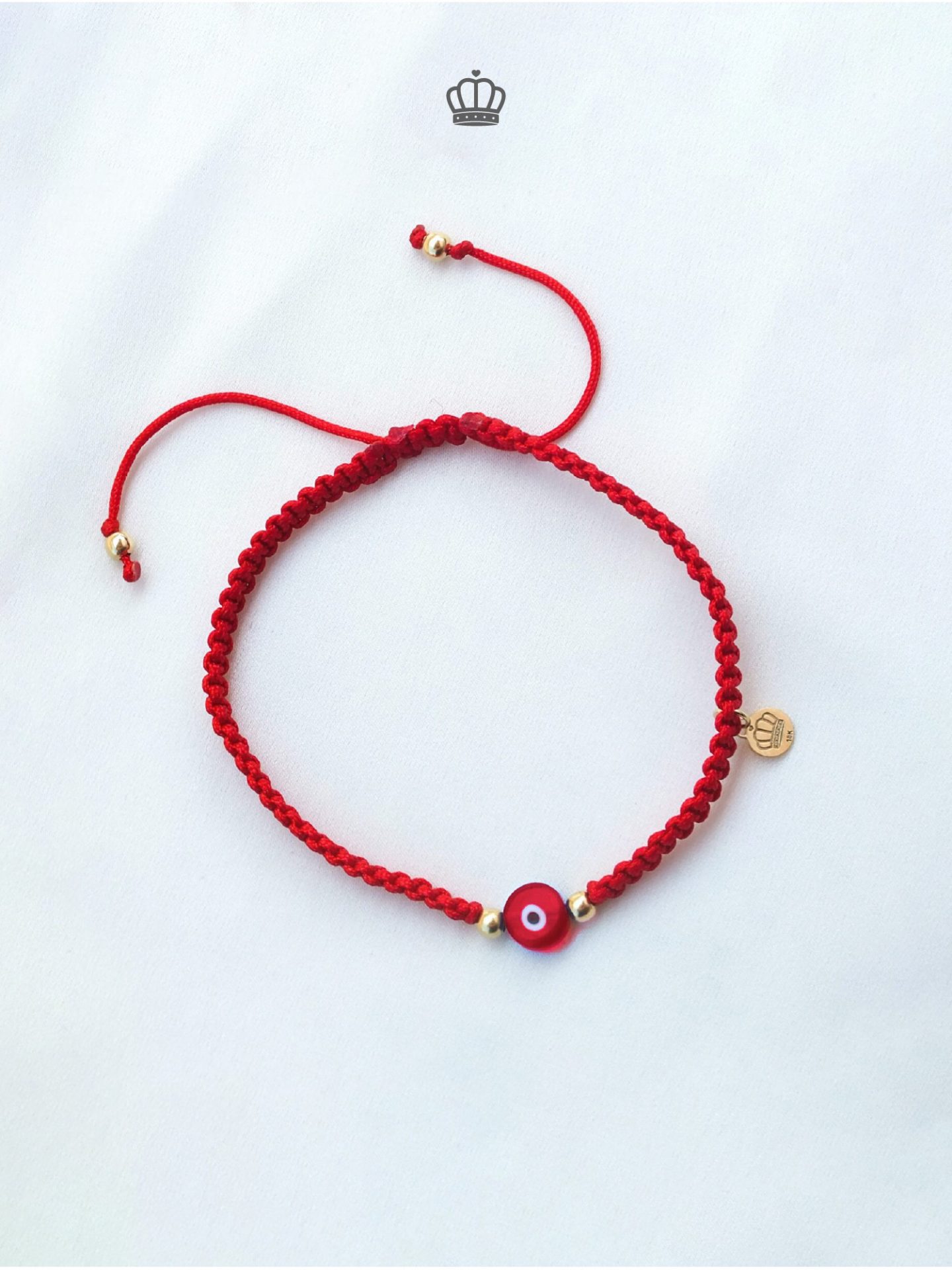Pulsera tejida a mano con hilo rojo con dije de ojo turco color rojo de protección y charm de coronita petunia en oro 18k.