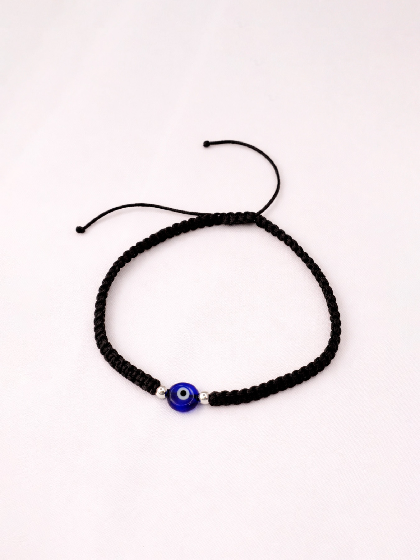 Pulsera tejida con hilo de algodon y ojo turco para la protecccion con bolitas de plata.
