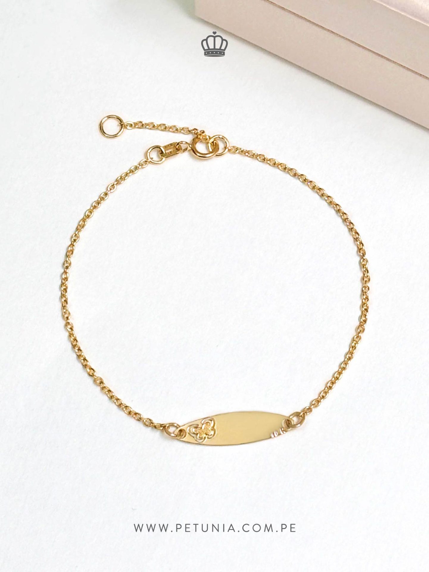 Pulsera de oro 18k con delicada placa donde se puede grabar (fecha, inicial o nombre) tiene una mariposa lateral, símbolo de transformación y libertad. Ideal para un diseño sutil y sofisticado.